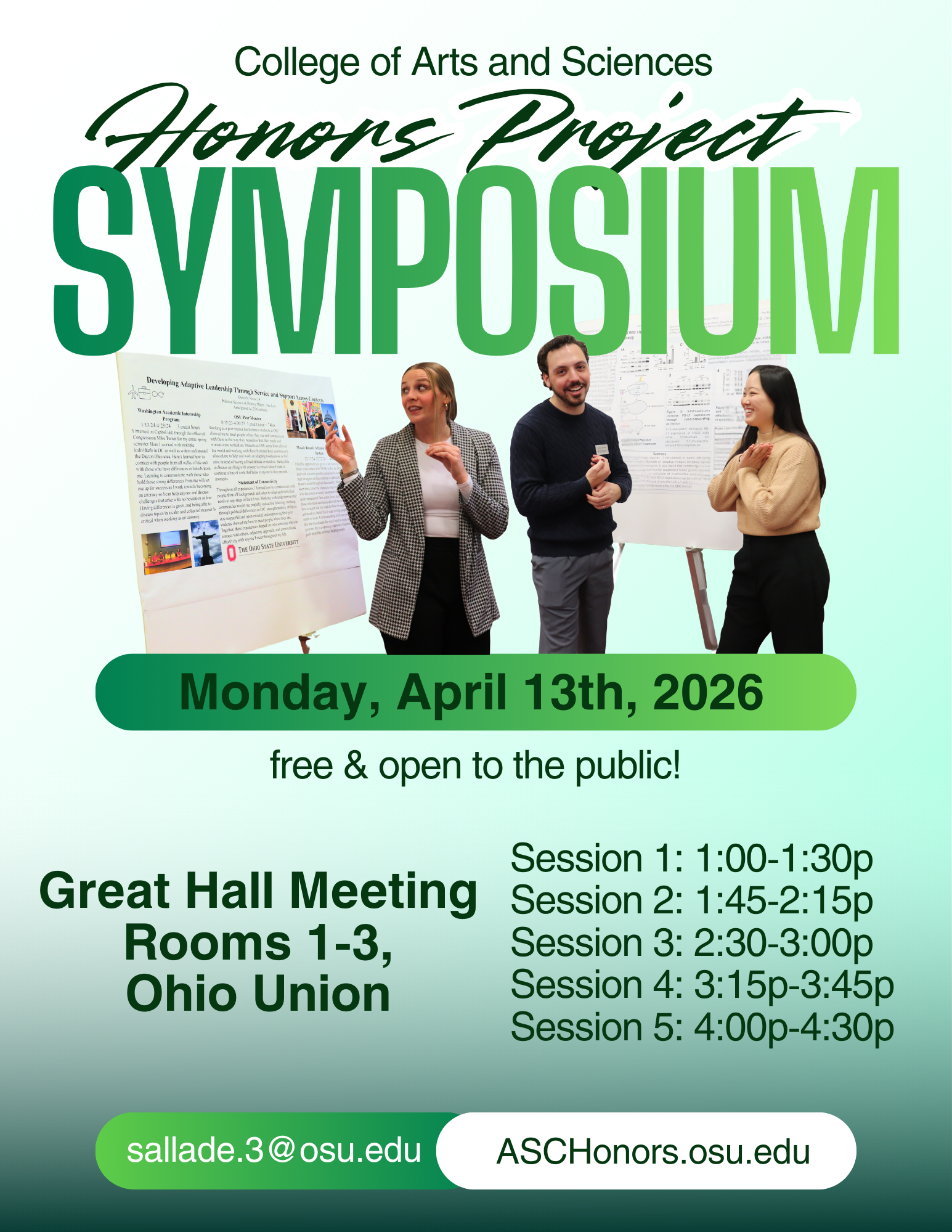 We hope you will consider joining us for our Spring 2026 Honors Project Symposium on April 13th from 1p-4:30p! The event will take place in the Ohio Union, Great Hall Meeting Rooms 1-3.